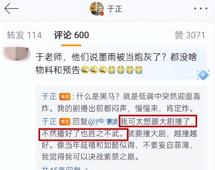 然而,于正却似乎并不担心。他曾在社交平台上公开表示:“我可太想和大剧撞了,要不然胜之不武。”这番言论,在当时引起了不少争议。有人认为他过于狂妄,有人则认为他是在故弄玄虚。但无论如何,于正的这番话,都透露出他对《墨雨云间》的信心。